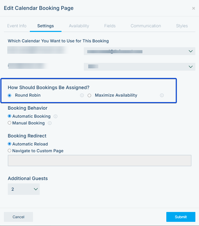 In the Settings tab, choose how bookings should be distributed across your selected calendars: