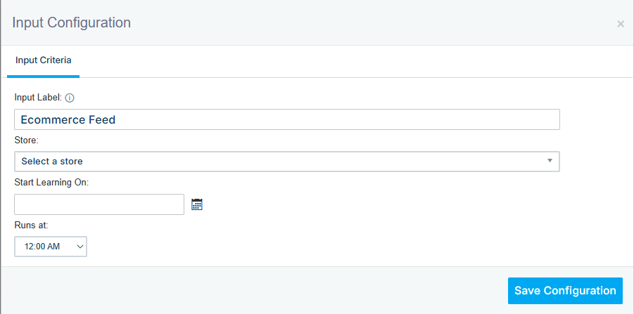 In the Ecommerce feed configuration, select your store (Product feed) and set a date/time to launch the learning process.
