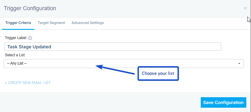 The workflow will run when the task stage is updated for contacts already associated with the selected list.